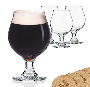 The curvy design of the bowl allows the drinker to warm the beer through the heat of his/her hands, while the stem slows down this process, keeping the rich taste of the beer for a long time. The stem is thick and sturdy, which provides stability and ensures that the glass doesn’t trip over. The glass is chip-resistant and dense, making it suitable for putting it in the dishwasher, microwave or freezer. Moreover, this set of stunning glassware is accompanied by four top-quality cork coasters, designed by Ecodesign US. The coasters protect your table or any other surface from staining and scratching.